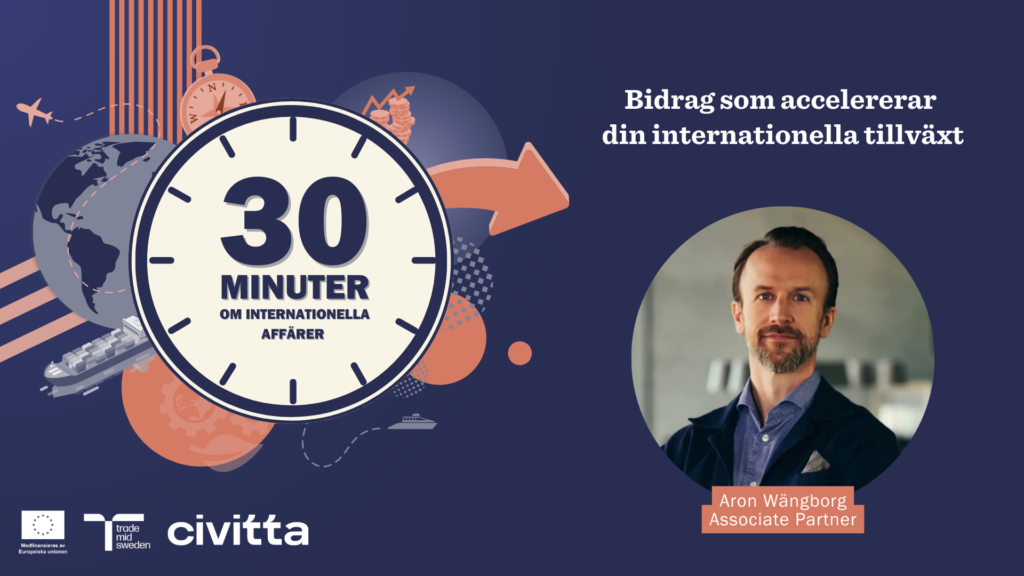 Aron Wängborg från Civitta delar med sig av konkreta insikter om hur företag kan använda offentlig finansiering för att accelerera sin internationella tillväxt.